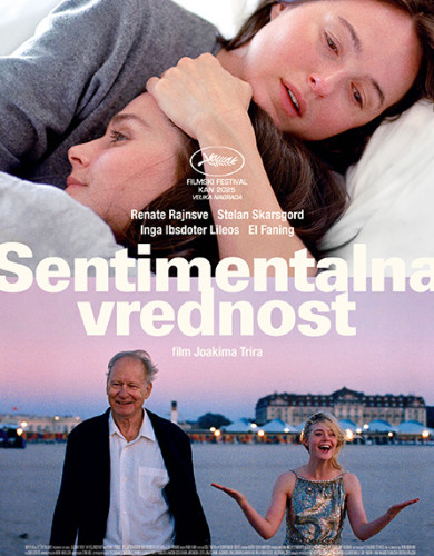SENTIMENTALNA VREDNOST (Affeksjonsverdi) – 133 minuta – Taramount – drama – 2D – glumci: Elle Fanning, Stellan Skarsgård, Renate Reinsve; režija: Joachim Trier; Porodična drama o dve sestre povezane neraskidivom bliskošću i njihovom ocu koji iznenada ponovo postaje deo njihovog života. Reditelj i scenarista Joakim Trijer predstavlja nam svoj novi film, porodičnu dramu o dve sestre povezane neraskidivom bliskošću i njihovom ocu koji iznenada ponovo postaje deo njihovog života, što otvara prostor za oproštaj i pomirenje.