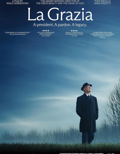 LA GRAZIA – 133 minuta – MCF – drama, romantični/ ljubavni – 2D – glumci: Toni Servillo, Anna Ferzetti, Orlando Cinque, Massimo Venturiello, Milvia Marigliano, Giuseppe Gaiani; režija: Paolo Sorrentino; Marijano De Santis je predsednik Republike Italije. Nema veze ni sa jednim pravim predsednikom. On je u potpunosti proizvod autorove mašte. Udovac i katolik, ima ćerku Doroteu, pravnicu poput njega samog. Kako se njegov mandatbliži kraju, usred dana bez događaja, pojavljuju se dve poslednje dužnosti, dve delikatnemolbe za predsedničko pomilovanje.